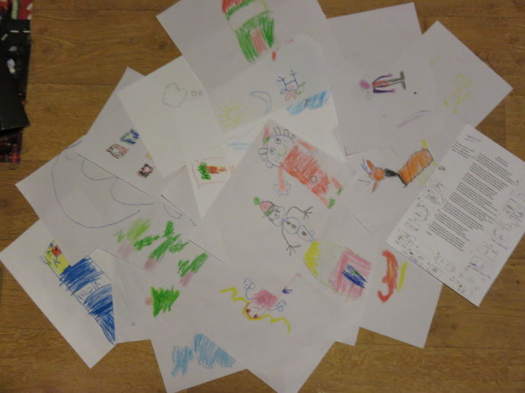 Zoe (5) and Tom (6) did the drawings in crayon. Zoe did the voice over and Tom the sound effects, all on my iPhone. Boo the cat also joined in. The audio was pimped in Adobe Audition.
